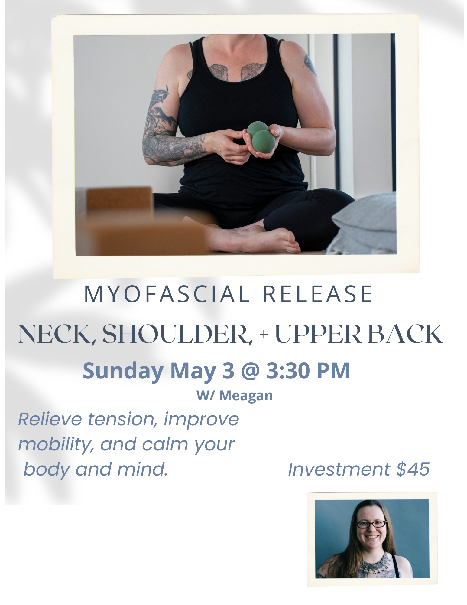 Yes! Myofascial pain syndrome sounds complex but it really refers to muscle pain and soft tissue inflammation. “Myo” means muscle and “fascial” is the thin, connective tissue that encases every muscle. Myofascial pain. As a result, myofascial pain can occur in any part of the body and is usually caused by a traumatic event or tension caused by stress of repetitive movements or awkward actions. Yoga with its infinite poses and deep-breathing, stretching exercises can provide myofascial release which helps the tissues better adapt to otherwise painful movements. Yoga coupled with deep breathing benefits stiff and sedentary bodies and a healthy fascial system. We also offer myofascial release workshops every few months.